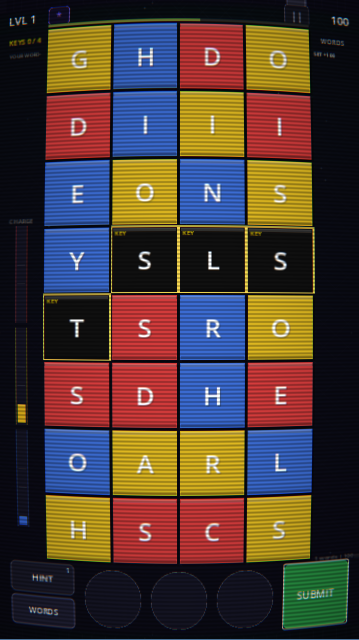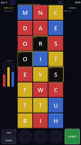 - Orb ability system — Every word you spell charges red, yellow, and blue orbs. When full, unleash Bomb (destroy a tile), Freeze (pause the timer), Scramble (reshuffle the board), or combine all three into a devastating Rainbow Beam that clears an entire column