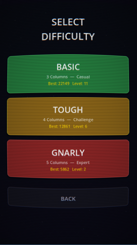 - 3 difficulty modes — Basic (3 columns), Tough (4 columns), Gnarly (5 columns) — each plays completely differently