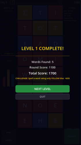 - Combo chains — Submit words quickly to build score multipliers. Color-match bonuses stack on top for massive points